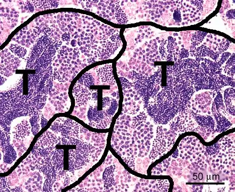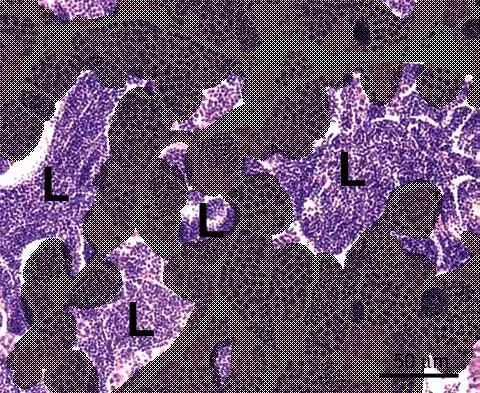 The seminiferous tubules [T] are separated by thin strands of interstitial connective tissue [highlighted in right image]. This interstitial tissue contains connective tissue cells [c] and Leydig cells [L] (intermediate sized cells with a round-oval nucleus), which produce androgen when stimulated by the pituitary-derived gonadotropic hormone.