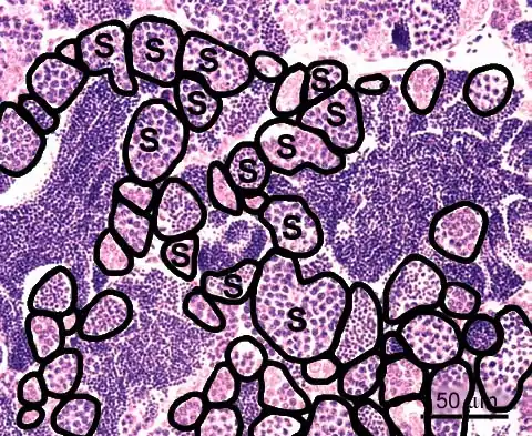 In the image below it is also evident, that the lining seminiferous tissue is built of clusters of cells, the so called spermatocysts [S]. |