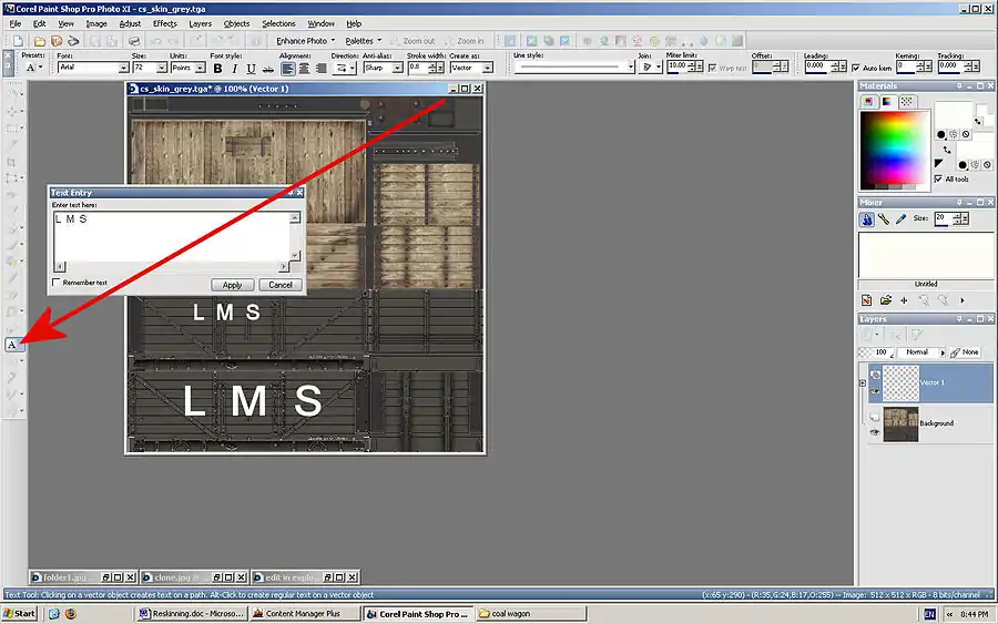 To add lettering use the letter tool seen here adding white lettering to the grey version of the cs_skin.tga file.