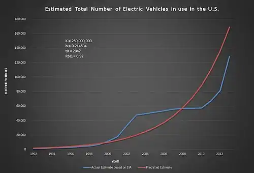 The growth experienced in the past two years seems to beat any previous trends, and technology and early success of Tesla Motors has something to do with that. There are still many hurtles to be cleared before the electric vehicle achieves widespread adoption, but the future is more promising than it has ever been. If a car company can make an affordable 200 mile range car that charges in about as much time as a gas tank, chances are very strong for full scale implementation. Based on a best curve fit (S-curve) on data relied upon by the EIA, and an assumption that all 250 million cars will be converted or replaced by electric, 2047 will be the year in which 50% of the market has been replaced.