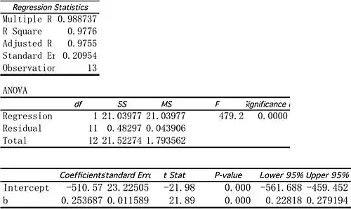 The regression result for K=1200 is shown in the table below. The result shows that b=0.2537, intercept is -510.57. So the t0 (year in which 1/2 K is achieved) is 2012.49507, which means half of annual ridership of saturation is reached just months ago.