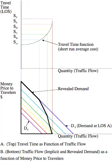So the implicit demand and revealed demand are not identical, rather the revealed demand is formed by projecting the travel time at a given flow onto the implicit demand curves. So for instance, when the price charged users is high, the revealed demand coincides with the implicit demand at level of service A (DA). As the prices are lowered, the revealed demand crosses the implicit demand curve at level of service B (DB), then DC, DD, DE and finally at a zero money price it crosses DF. While the actual prices that generate specific demand levels vary from place to place with local circumstances, demand preferences, and market conditions, the general trend (higher prices gives lower approach flow gives better level of service) is simply an application of the law of demand from economics along with traffic flow theory.