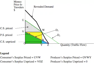 The concepts in Figure 2 can be used to develop the welfare analysis shown in Figure 3. There are several areas of interest in Figure 3. The first is defined by the lower left triangle (the blue + green) (triangle VOZ) which is the consumer surplus when the road is unpriced. The second is the producer surplus (profit) to the road authority when the road is priced, illustrated by the rectangle formed in the lower left (yellow + green) (rectangle OVWY). The third is the consumer surplus when the road is priced, shown in gray (triangle UVW). This consumer surplus represents a higher reservation price than the other because the level of service is better when flow is lower.