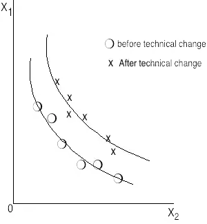 The consequence of technical change is to shift the production function up (or equivalently, as we shall see, the cost function down), it can also change the shape of the production function because it may alter the factor mix.