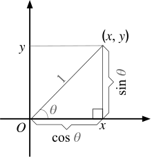 Draw a line of unit length, , from the origin to a point that is angled anti-clockwise from the horizontal axis. Then, indicate a line parallel to the vertical axis and a line parallel to the horizontal axis from the point .