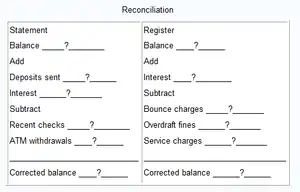 The bank sends you a statement each month which tells its record of your account for the past month. It contains information you don’t know about yet, such as amounts you were charged by the bank. Your checkbook’s register contains information you wrote down that the bank doesn’t know about yet, such as very recent checks you wrote and possible mistakes. If you balance your checkbook with your bank statement each month, you notice mistakes such as forgotten ATM withdrawals or forgotten pay check deposits. By the way, write “for deposit only” on the back of the check above where you’re going to sign it before you bring it to the bank. To balance your checkbook, first do the check register. A. Write down your checkbook’s balance. B. Subtract from that all the service charges reported on the statement, adding those together first. C. To the subtraction answer add the interest the statement says you earned, and that answer is the corrected balance. Next do the bank statement corrections. A. Write down the bank statement’s balance. B. Add to it any deposits you reported in you checkbook that were not on the bank’s statement. C. Subtract checks you wrote that haven’t reached the bank yet. D. From that subtract any withdrawals not reported. This also is the corrected balance. If the two corrected balances aren’t the same, find out why.[7]