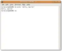 When "Terminal" is clicked a command line terminal opens, using BASH. The prompt takes the form of fred@desktop where fred is the name of the user entered when setting up Gnome on first use and desktop is the name of the computer. Linux commands may be entered directly at the terminal.