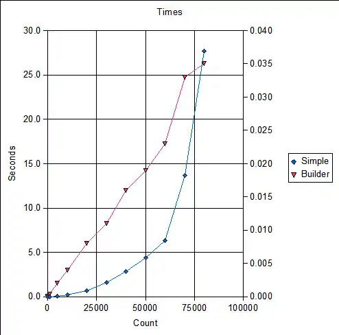 lLen is the length of the string. If you look at the table of execution times below you can see that for values of Count up to about 100 the simple method is faster but hat above that the time for simple concatenation increases roughly exponentially whereas that for the string builder increases roughly linearly (tested in the IDE, 1.8GHz CPU, 1GB ram). The actual times will be different on your machine but the general trend should be the same.