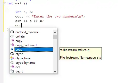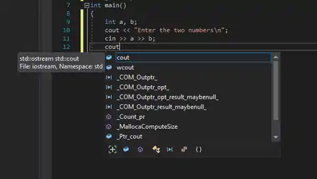 We’re now going to insert a cout line giving the sum of the two numbers. As cout is entered, Visual Studio immediately displays a box suggesting possible results for what you have just entered.