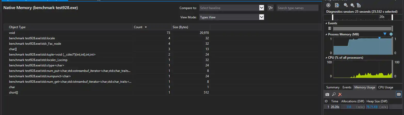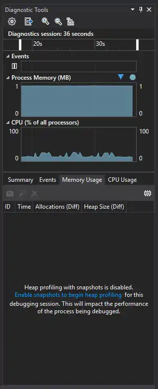 Now once a breakpoint is hit or the program execution is paused, the memory usage corresponding to the time the snapshot was taken can be viewed: