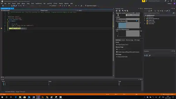 Now debug the program. When the specified line is reached, the program stops. Here’s how Visual Studio looks during this step for an example program: