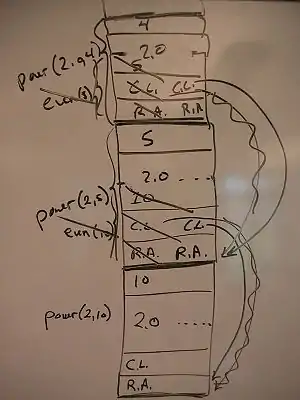we might draw one box for each word (and a large box for a double word), producing a diagram like the following for (for example) the point at which we are checking to see if 4 is even during the computation of power(2, 10) --- carefully formatted and hand-drawn images might look like this (the potentially confusing cross-outs and erasures in the hand-drawn image are the motivation for the Memory Evolution Diagrams below):