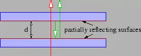 - A Fabry-Perot interferometer (see figure 1.20) consists of two parallel half-silvered mirrors placed a distance from each other as shown. The beam passing straight through interferes with the beam which reflects once off of both of the mirrored surfaces as shown. For wavelength , what values of result in constructive interference?