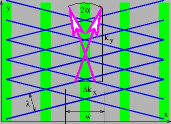This is in the form of a sine wave moving in the direction with phase speed and wavenumber , modulated in the direction by a cosine function. The distance between regions of destructive interference in the direction tells us the width of the resulting beams, and is given by , so that