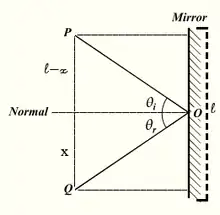 Figure 3.1 shows the wave vector and wave front of a wave being reflected from a plane mirror. The angles of incidence, , and reflection, , are defined to be the angles between the incoming and outgoing wave vectors respectively and the line normal to the mirror. The law of reflection states that . This is a consequence of the need for the incoming and outgoing wave fronts to be in phase with each other all along the mirror surface. This plus the equality of the incoming and outgoing wavelengths is sufficient to insure the above result.