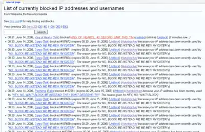It is helpful for all involved, especially AOL users, who are often chronically autoblocked by collateral damage, to remain patient and remember that it is the software, not the admin who is unfortunate enough to have his or her name appear on the block, who is responsible. Equally important is for admins to check Special:Ipblocklist regularly, and unblock all autoblocks from a particular user if more than two autoblocks are set in rapid succession. (If more than two IPs are autoblocked within seconds/minutes of each other, it is a good indication that it is a dynamic IP pool and the blocks are collateral damage.)