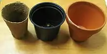 ![]() From left to right: a biodegradable pot, a plastic pot, and a clay pot. PotsA planting pot is used to hold the soil. You can think of it like the walls in your home, but for the seed to grow in. Which pot should I use? If you are planting your seeds inside, you will need a container to put the soil into. As long as it is big enough to support the growing seed, you can use it. You can use an empty can, or you can buy a pot. There are several types of pots you can use for planting the seed. If you are keeping your plant inside, a strong and sturdy pot will work. If you are going to move your plant outside after it sprouts, you can buy a pot that will break down when the pot is planted in dirt. These kind of pots are biodegradable. There are also trays of little containers called a seed starting tray which work well for planting a lot of seeds at once.