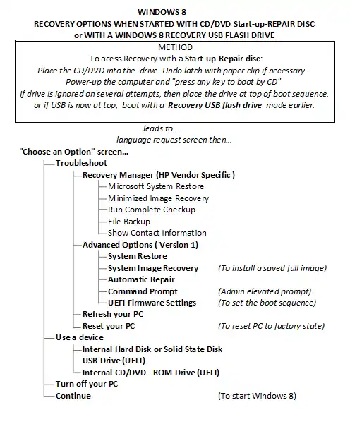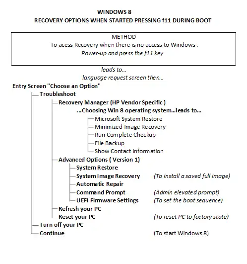 - The third drop-box's layout, Specific Recovery Options for Windows 8 takes the same approach as for that of Windows 7. In fact there are more methods shown than for Windows 7. and the three listings here are also in tree format. Notice the change to f11 for the key boot-up, but see the notes in the section below for the use of f8. If laptop viewing of such detail becomes difficult, just click the box contents to view the images in full scale. Use f8 starts in Windows 8.