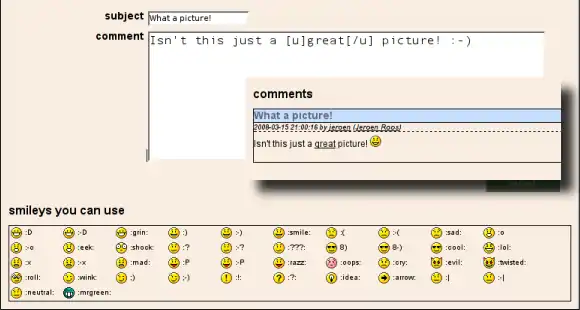 [u]underline[/u], [i]italics[/i] and [b]bold[/b], the various possible smileys are displayed with the comment input form: