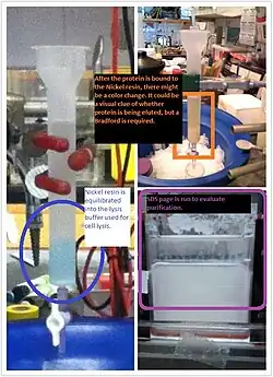 After the pellets are suspended in lysis buffer, lysozyme, DNase, and RNase are added, and inculated for at least 10 minutes. If inadequate amount of any of these are added, the pellets will appear sticky during lysis and lysis might be incomplete. After lysis, the sample is spun down to obtain the soluble fraction that contain our desired protein. It is crucial to keep the whole lysing process cold as some protein might precipitate in room temperature, or machine got heated up will cause a loss of protein. With the soluble fraction that contain our protein of interest, further purification can be done. Such as salting out, ion exchange, and affinity chromatography. Further purification might involve FPLC.