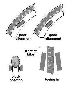 - It is impossible to set firm brakes if the blocks cannot be set close to the rims. For brakes needing narrow' clearances, e.g. 1mm to 1.5mm, the toeing-in needs also to be narrower than usual. If the toeing-in were set to the usual 1mm more than the front of the block, then for the above example, the average clearance for each block would be 1.5mm to 2mm, and the brake would feel soft. Thus, the toeing-in needs to be minimal if a firm or hard brake is required. In fact some brake manufacturers recommend no toeing-in for their products. Brakes that use wider settings by design, are affected less by toeing-in.