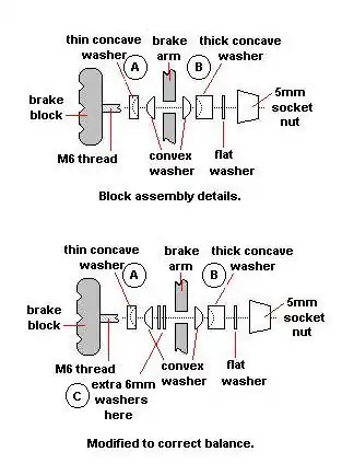- If the brakes balance, but at opposite screw extremes, then further adjustments are prevented. First consider all of the above solutions; i.e., is the tighter of the two binding, etc.? If you are stuck with unmatched springs in the brake arms, (rare, since the set that came with the bike are matched in manufacture), it may be possible to get the screws back into mid-range with a washer or two. Add thin 6mm washers, as shown in Figure 6, to the brake block assembly that habitually has the wider of the two gaps. Adjust the number of washers until the balance is achieved closer to the balance screws' midpoints. When all else has failed, and a fix of this kind is being considered, do not forget to consider the buying of a new set of brakes, and getting the bike shop to first take a look.