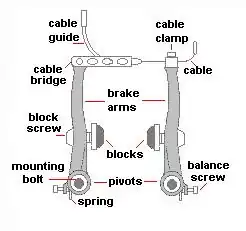 ![]() A. Cable Housing. B. Housing End Ferrule. C. Cable Guide. D. Housing Detent. E. Rubber Noodle. F. Cable Clamp. G. Cable Tail. H. Cable Cap. I. Brake Arm J. Brake Block (Pad). K. Block Setting Screw. L. Arm Mounting Bolt. |