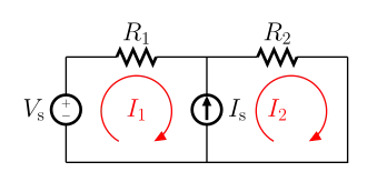 If a voltage source is present within the mesh loop, the voltage at the source is either added or subtracted depending on if it is a voltage drop or a voltage rise in the direction of the mesh current. For a current source that is not contained between two meshes, the mesh current will take the positive or negative value of the current source depending on if the mesh current is in the same or opposite direction of the current source.The following is the same circuit from above with the equations needed to solve for all the currents in the circuit.