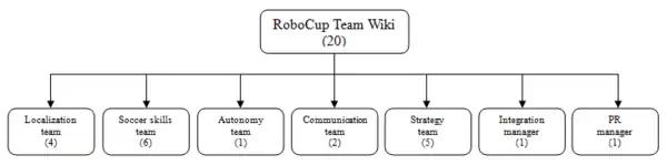 To garantuee the above mentioned cooperation between the different teams, an integration manager is appointed. The integration manager is a generalist with a broad technical knowledge, able to “see the total picture” and make one coherent system from different components. Every team also needs a public relations (PR) manager to promote the team and make the necesarry arrangements to compete in the different tournaments. An overview of the different teams of RoboCup Team Wiki with the corresponding number of members (#) is given in Figure 2.