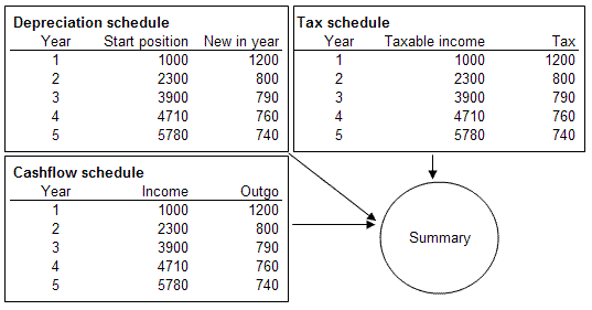 The model can be divided into sections such as tax, depreciation, revenue cashflows, etc., and each of these can be put into a separate "block", usually on a separate sheet. The results are then consolidated in a summary sheet.