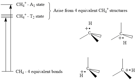 One misconception concerning orbital hybridisation is that it incorrectly predicts the ultraviolet photoelectron spectra of many molecules. While this is true if Koopmans' theorem is applied to localized hybrids, quantum mechanics requires that the (in this case ionized) wavefunction obey the symmetry of the molecule which implies resonance in valence bond theory. For example, in methane, the ionized states (CH4+) can be constructed out of four resonance structures attributing the ejected electron to each of the four sp3 orbitals. A linear combination of these four structures, conserving the number of structures, leads to a triply degenerate T2 state and a A1 state.[20] The difference in energy between the ionized state and the ground state would be the ionization energy, which yields two values in agreement with experiment.