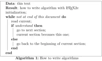 Complete documentation is listed at [2] . Most commands are similar to the algorithmicx equivalents, but with different capitalization. The package algorithms bundle at the ctan repository, dated 2009-08-24, describes both the algorithmic environment (for typesetting algorithms) and the algorithm floating wrapper (see below) which is designed to wrap around the algorithmic environment.