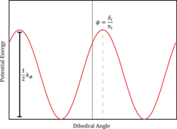 Where k is the rotational barrier of the system, n is the periodicity as the rotations repeat around 360 degrees, ɸ is the dihedral angle, and δ is the offset of the function