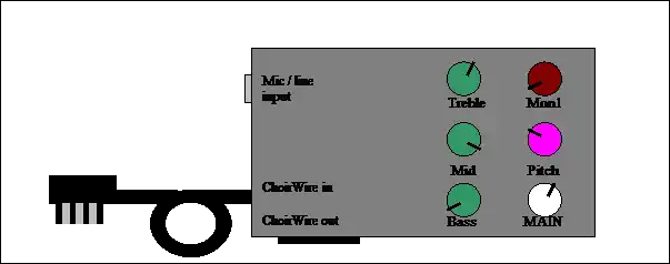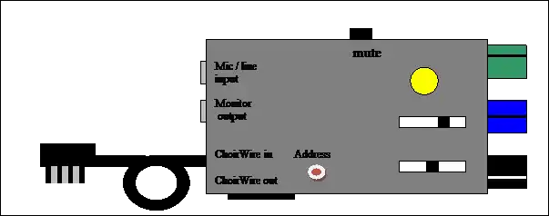 This example shows an implementation of a distributed input. In the middle (red) the adjust button for addressing. On the left (or bottom side, if turned) the connectors for the input (microphone, e-guitar, keyboard,…), the monitor output (for example in-ear monitor or headphone) and – the ChoirWire input. A ChoirWire output is foreseen to make chains of musicians possible. With the yellow “solo” button the solo offset of this input can be switched on and off. So no intervening from the mixing console is necessary. With the “mute” button the input can be switched off short time – for example while coughing. The right three buttons are a small mixer for the monitor out. It mixes the own input, and two other channels from main channel, monitor 1, monitor 2, monitor 3 or monitor 4. So for example a singer can individually mix his monitoring from himself, the piano on monitor 2 and the complete set from main. Of course other implementations are possible, for example a pure input without monitoring and a pure distributed output without addressing.