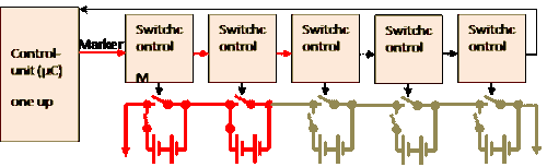 If the end of the chain is reached, the "switched on" marker is fed through the control unit to the first cell, which is switched on next.