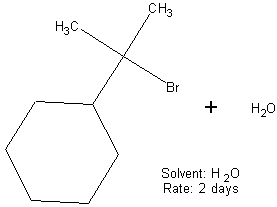 2) SN1. Tertiary carbon, polar solvent. Very slow reaction rate.