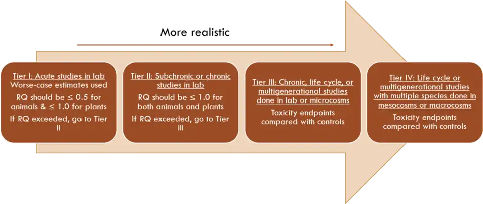 Tiered Testing: A toxicity testing method where lower tiered studies (representing simple worse-case scenarios) are followed by higher tiered studies (representing complex realistic scenarios).