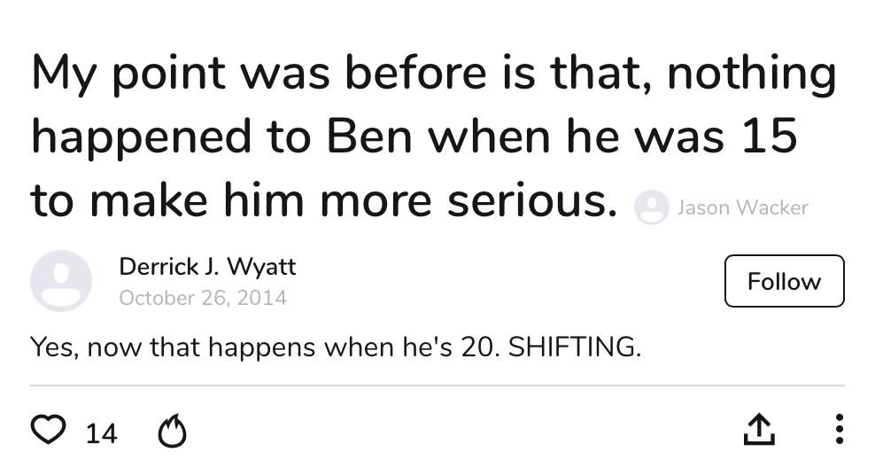 - Wyatt, Derrick J. (September 13, 2020). "Ben 10K now serious at Age 20". Static Wikia. Retrieved May 7, 2020.