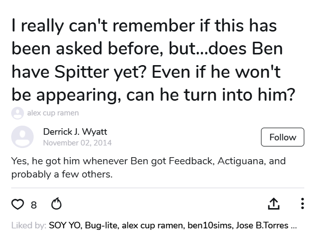 - Wyatt, Derrick J. (March 23, 2020). "OV Spitter, Feedback, Arctiguana unlocked after Destroy All Aliens and before Omniverse Flashbacks". StaticWikia. Retrieved May 7, 2024.
