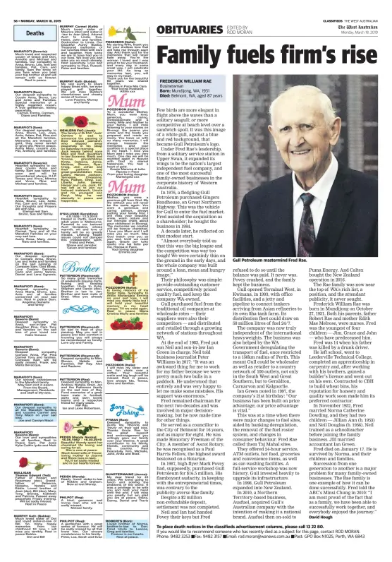 - Mough, David (18 March 2019). Moran, Rod (ed.). "Family fuels firm's rise". Obituaries. The West Australia. p. 34. Retrieved 29 December 2020 – via PressReader.com. (Page 34 Archived 29 December 2020 at archive.today)