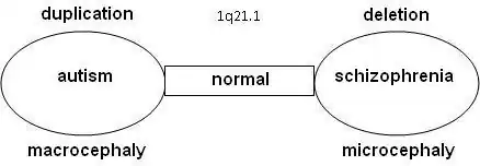 Statistical research showed that schizophrenia is more common in combination with 1q21.1 deletion syndrome. On the other side, autism is significantly more common with 1q21.1 duplication syndrome. Further research confirmed that the odds on a relation between schizophrenia and deletions at 1q21.1, 3q29, 15q13.3, 22q11.21 en Neurexin 1 (NRXN1) and duplications at 16p11.2 are at 7.5% or higher.[10][11]