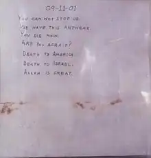 Also unconnected to the anthrax attacks was a large envelope received at American Media, Inc., in Boca Raton, Florida (which was among the victims of the attacks), in September 2001. It was addressed "Please forward to Jennifer Lopez c/o The Sun", containing a metal cigar tube with a cheap cigar inside, an empty can of chewing tobacco, a small detergent carton, pink powder, a Star of David pendant, and "a handwritten letter to Jennifer Lopez. The writer said how much he loved her and asked her to marry him."[34] Another letter, which mimicked the original anthrax letter to Senator Daschle, was mailed to Daschle from London in November 2001, at a time when Hatfill was in England, not far from London.[35][36][37] Shortly before the discovery of the anthrax letters, someone sent a letter to authorities stating, "Dr. Assaad is a potential biological terrorist."[38] No connection to the anthrax letters was ever found.[39]