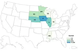 265 people in 8 states were identified to carry similar Salmonella Typhimurium strains,[2] predominantly in Iowa (240 cases). Additional cases appeared in Illinois (10), Nebraska (5), Minnesota (4), South Dakota (3) and in Indiana, Mississippi and Wisconsin, with one case respectively.[7]