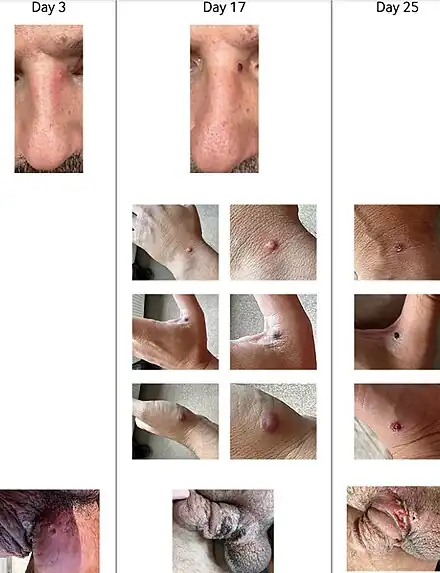 The 2022–2023 outbreak initially had a different pattern of spread compared to prior mpox outbreaks outside Africa.[109] Genetic evidence suggest the outbreak likely started in Nigeria.[110][111] Given the unusually high frequency of human-to-human transmission observed in this event, and the probable community transmission without history of traveling to endemic areas, spread of the virus through close contact is more likely, with transmission during sexual activities being the most common route.[112] Most cases have been in men.[113] A significant proportion of cases, although not all, are in men who have sex with men (MSM), notably in Canada, Spain, and the UK,[113] with many cases diagnosed in sexual health clinics.[109] Cases are mostly in young and middle-aged men.[114] This points to transmission due to close contact during sex as being the main route of transmission.[113] In May 2022, the European Centre for Disease Prevention and Control (ECDC) considered the monkeypox virus to be moderately transmissible among humans. According to the centre, among MSM who contracted the virus, the most common means of transmission is likely through sexual activity due to intimate contact with infectious skin lesions. The ECDC rated likelihood of transmission due to close contact, including sexual contact, as "high", but, without close contact, as low.[112] In Nature, Anne Rimoin and Raina MacIntyre speculate that the higher percentage of MSM affected is a result of coincidental introduction to the community and then sexual activity constituting "close contact" rather than the virus itself becoming sexually transmitted.[115] However, in a study published in August 2022, infectious monkeypox virus was able to be isolated from semen samples,[116] and the prolonged shedding of virus in seminal fluids raised the possibility of a genital reservoir for human mpox.[116]