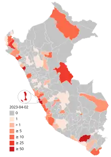 The 2022–2023 mpox outbreak in Peru is a part of the outbreak of human mpox caused by the West African clade of the monkeypox virus. The outbreak reached Peru on 26 June 2022.[1]