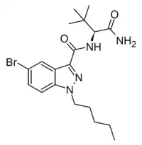 ADB-5'Br-PINACA (5'-Br-ADB-PINACA) is an indazole-3-carboxamide based synthetic cannabinoid receptor agonist that has been sold as a designer drug. It was first identified in Abu Dhabi in September 2022[1] but has subsequently been found in the US and Europe.[2] While formal pharmacology studies have not yet been carried out, ADB-5'Br-PINACA is believed to be a highly potent synthetic cannabinoid with similar potency to compounds such as MDMB-FUBINACA and 5F-ADB, which have been responsible for numerous fatal and non-fatal drug overdoses, consistent with previously reported compounds from the patent literature showing bromination of the indazole ring at the 5-, 6-, or 7- positions to increase potency over the unsubstituted analogues.[3] ADB-5'Br-PINACA is the 5'-bromo analog of ADB-PINACA.