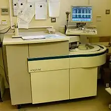 The Abbott AxSYM is an immunochemical automated analyzer made by Abbott Laboratories. It is used for serology tests and therapeutic drug monitoring, and uses antibodies to alter the deflection of polarized light. It can also be used to monitor hormone level and some cardiac markers such as troponin.[1][2]