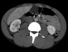 | Abdominal trauma resulting in a right kidney contusion (open arrow) and blood surrounding the kidney (closed arrow) as seen on CT | |