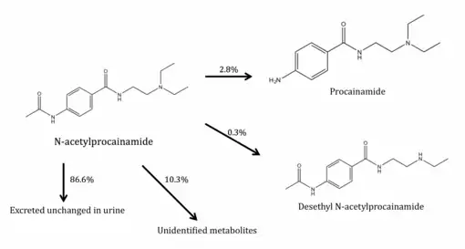 - 1 2 3 4 Connolly SJ, Kates RE (1982). "Clinical pharmacokinetics of N-acetylprocainamide". Clinical Pharmacokinetics. 7 (3): 206–220. doi:10.2165/00003088-198207030-00002. PMID 6178545. S2CID 32155394.