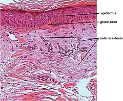 | Micrograph showing solar elastosis - grey, jumbled spaghetti-like material on bottom of image. H&E stain. | |